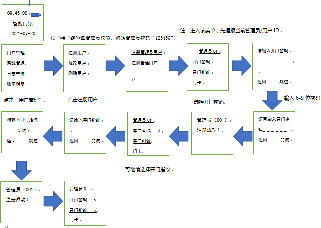 注:“123456”為出廠默認(rèn)的管理員密碼,當(dāng)注冊管理員用戶后,該密碼會(huì)自動(dòng)失效,下次進(jìn)入系統(tǒng)菜單需要驗(yàn)證已經(jīng)注冊的管理員指紋或密碼。